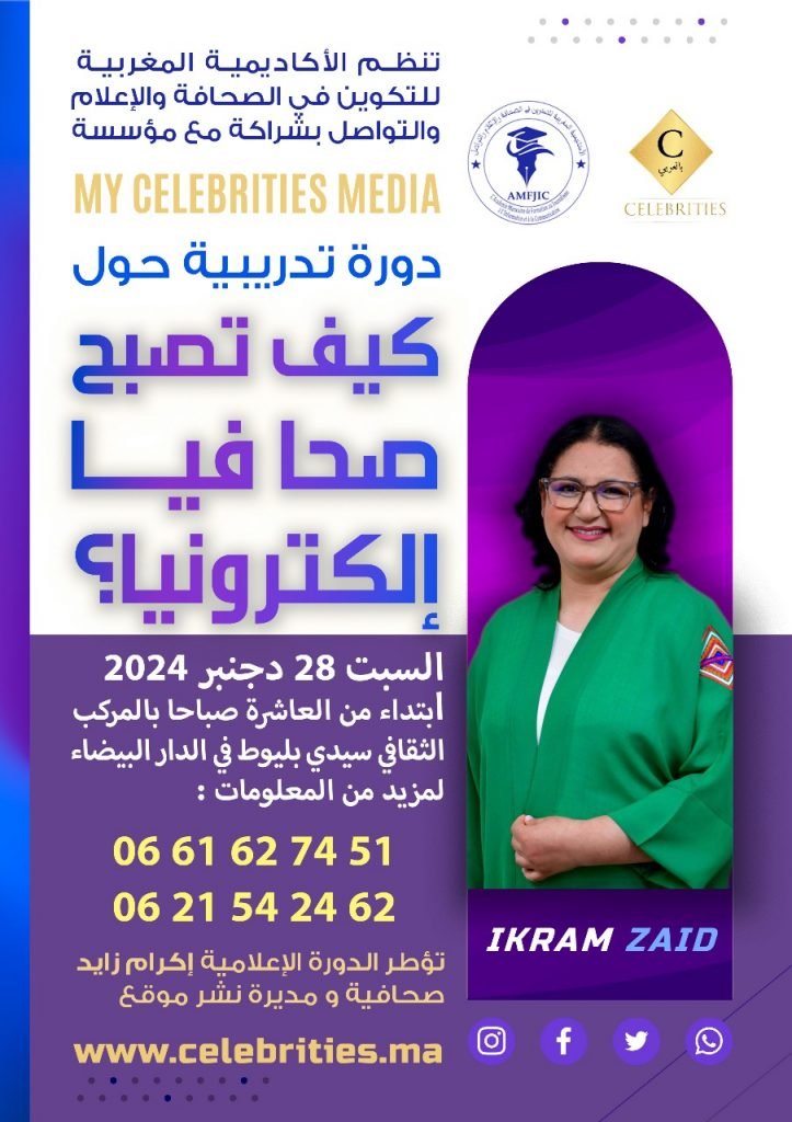 تنظم الأكاديمية المغربية للتكوين في الصحافة والإعلام والتواصل بشراكة مع مؤسسة “MY CELEBRITIES MEDIA” دورة تدريبية حول “كيف تصبح صحافيا، وذلك يوم السبت 28 دجنبر 2024 ابتداء من العاشرة صباحا بالمركب “إلكترونيا”؟ الثقافي بليوط بمدينة الدار البيضاء.