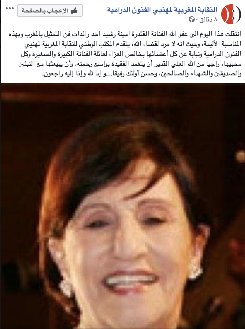 ونعت النقابة الوطنية لمهنيي الفنون الدرامية أمينة رشيد، عبر منشور جاء فيه “انتقلت هذا اليوم الى عفو الله الفنانة المقتدرة امينة رشيد احد رائدات فن التمثيل بالمغرب وبهذه المناسبة الأليمة، وحيث انه لا مرد لقضاء الله، يتقدم المكتب الوطني للنقابة المغربية لمهنيي الفنون الدرامية ونيابة عن كل أعضائها بخالص العزاء لعائلة الفنانة الكبيرة والصغيرة وكل محبيها، راجيا من الله العلي القدير أن يتغمد الفقيدة بواسع رحمته، وأن يبيعثها مع النبئين والصديقين والشهداء والصالحين، وحسن أولئك رفيقا…و إنا لله وإنا إليه راجعون”.
