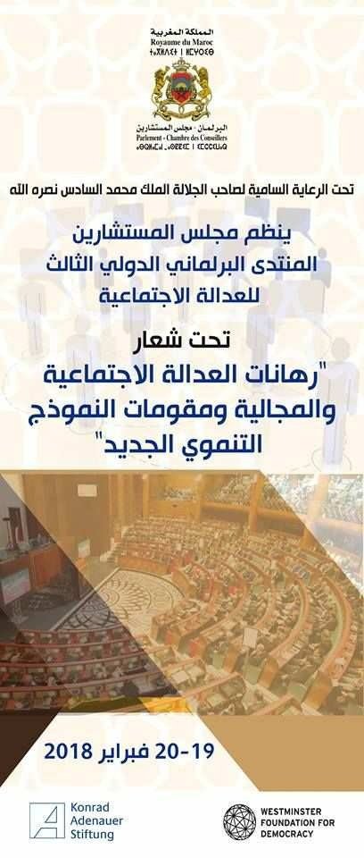 تفاعلا مع مضامين الخطاب الملكي السامي بمناسبة افتتاح السنة التشريعية 2018-2017 وتحت الرعاية السامية لصاحب الجلالة الملك محمد السادس نصره الله، ينظم مجلس المستشارين المنتدى البرلماني الدولي الثالث للعدالة الاجتماعية تحت شعار “رهانات العدالة الاجتماعية والمجالية ومقومات النموذج التنموي الجـديد” يومي 19 و20 فبراير 2018.