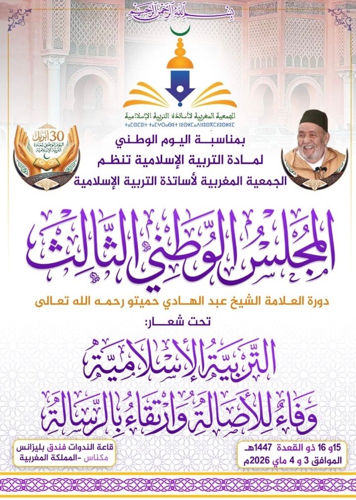 يعقد المكتب الوطني للجمعية المغربية لأساتذة التربية الإسلامية مجلسه الوطني يومي 3 و4 ماي 2026 بمدينة مكناس، بمشاركة ممثلي الفروع من مختلف أقاليم المملكة، لبحث رهانات مادة التربية الإسلامية وأدوارها داخل المنظومة التربوية، وتقييم أداء الجمعية واستشراف آفاق تطوير عملها، وذلك تحت شعار “التربية الإسلامية وفاء للأصالة وارتقاء بالرسالة”، تزامناً مع الاحتفال باليوم الوطني للمادة الموافق لـ30 أبريل.
