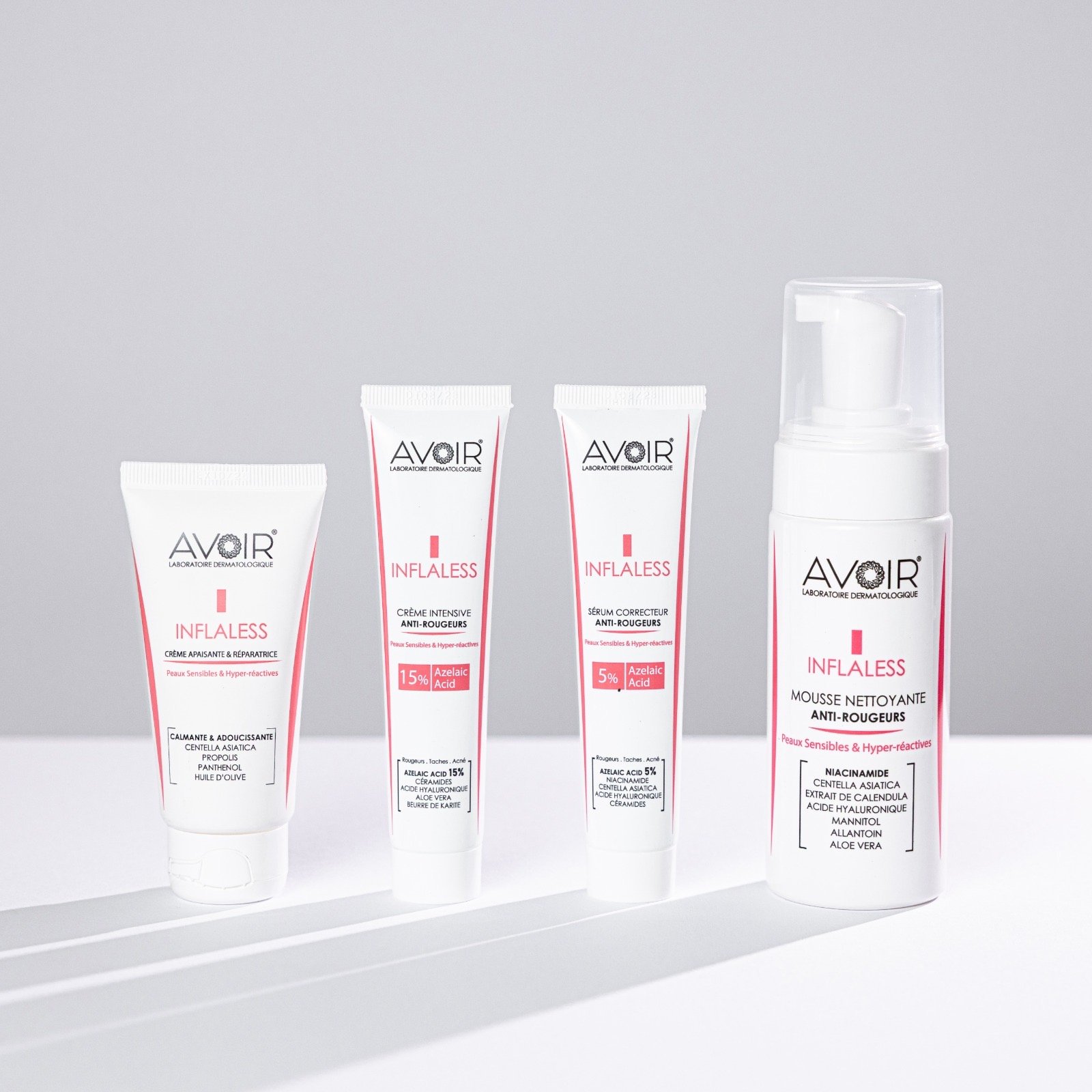 أطلقت AVOIR LABORATOIRE DERMATOLOGIQUE، المغربية المتخصصة في المنتجات التجميلية، مجموعة INFLALESS الموجهة لعلاج احمرار البشرة الحساسة والمعرضة للهشاشة. وتعتمد هذه التركيبة على مكونات فعالة أبرزها 20% من حمض الأزيليك، إلى جانب السنتيلا الآسياتيكا، والنياسيناميد، والسيراميدات، وحمض الهيالورونيك، وذلك بعد التحقق من فعاليتها عبر دراسات مخبرية وسريرية.