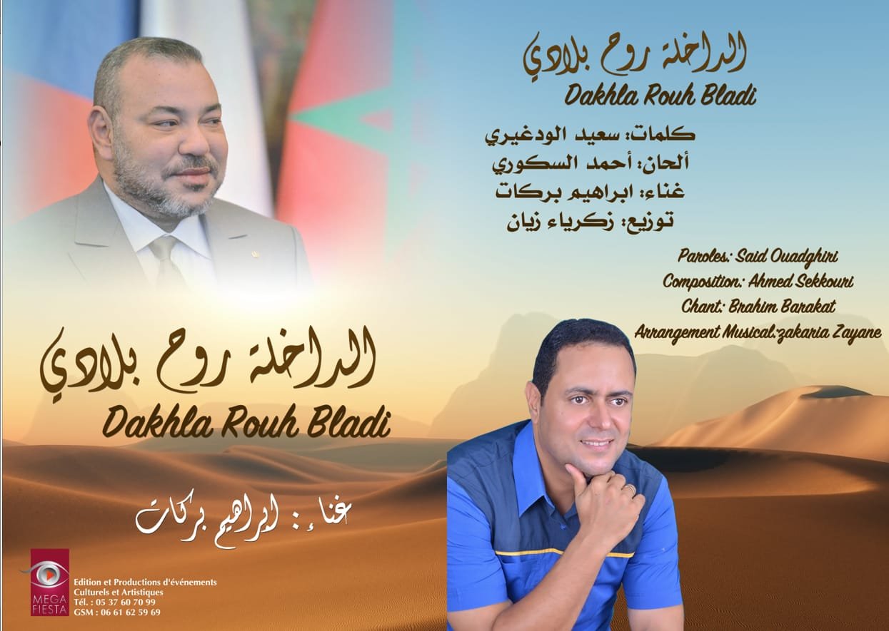 بعد الانتصار التاريخي في معبر الكركارات في جنوب الصحراء المغربية وكذلك الاعتراف التاريخي للولايات المتحدة الأمريكية بمغربية الصحراء وكذلك فتح مختلف السفارات العربية والإفريقية والأجنبية, أعلنت جمعية الأركسترا السمفونية المغربية للموسيقى الأصيلة بالرباط، والتي يترأسها الفنان والمايسترو “ابراهيم بركات” ,بتعاون وشراكة مع مؤسسة” ميكافييستا “للإنتاج عن إنتاج أغنية وطنية جديدة بعنوان ” الداخلة روح بلادي” من كلمات الأستاذ “سعيد الودغيري” , لحن الفنان الرائد “أحمد السكوري” ,غناء المايسترو “ابراهيم بركات” و توزيع الفنان “زكرياء زيان”.