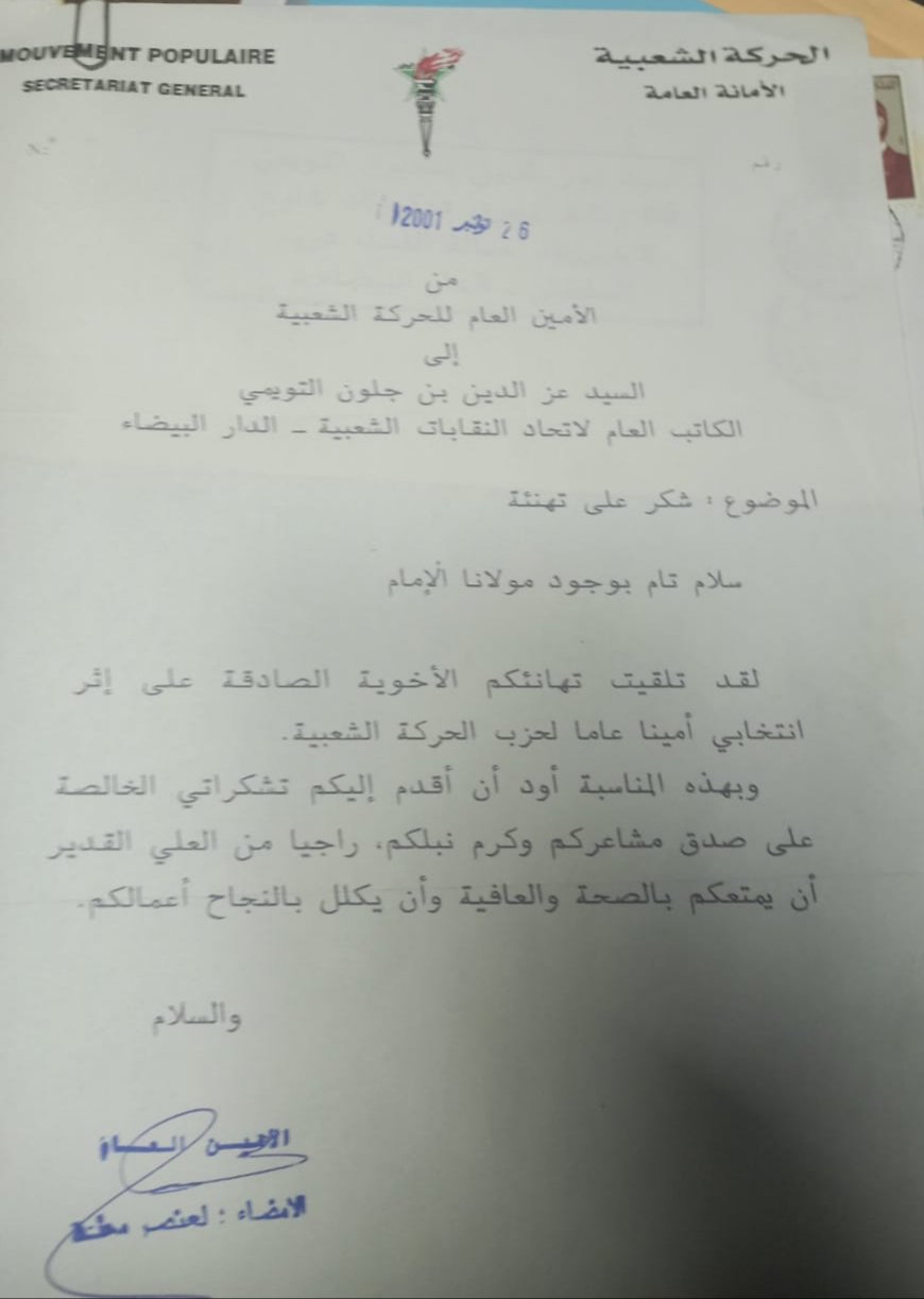 وتوالت خرجات العنصر الخطابية ومحاولاته لـ”وأد” المولود السياسي الجديد من خلال تقديم شكاية للسلطات القضائية لفتح تحقيق مع بنجلون واستدعائه بشكل مستعجل من طرف مجموعة الابحاث الجنائية التابعة لولاية أمن البيضاء بشأن توظيفه لاسم “اتحاد النقابات الشعبية” وبالتالي الطعن في شرعية مؤسسه بنجلون التويمي الذي بادر الى نشر وثائق يعتبرها “تاريخية دامغة” تفيد اعتراف العنصر بقيادة رفيقه آنذاك التويمي للذراع النقابي للحزب ومراسلته تحت صفة “الكاتب العام” لاتحاد النقابات الشعبية. (انظر الوثيقة)