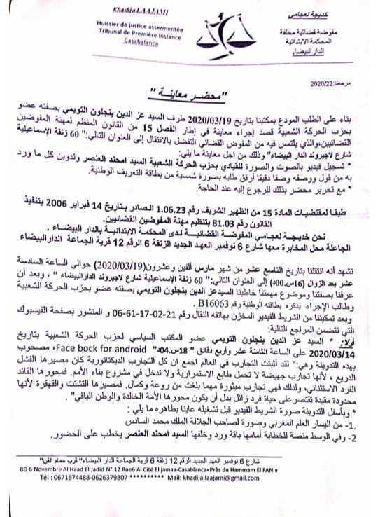 كما عزز بنجلون التويمي طعنه في تصريحات العنصر وخرجاته بنشره لمضمون شريط فيديو يُقِر فيه الامين العام لحزب الحركة الشعبية امحند العنصر بعضوية بنجلون بالمكتب السياسي للحزب ( انظر محضر المعاينة)