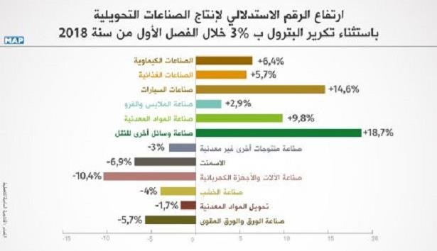 وأوضحت المندوبية السامية للتخطيط، في مذكرة إخبارية حول الرقم الاستدلالي للإنتاج الصناعي والطاقي والمعدني للفصل الأول من سنة 2018، أن هذا التطور يعود، أساسا، إلى ارتفاع الإنتاج في “الصناعات الكيماوية” بنسبة 6,4 في المائة، وفي “الصناعات الغذائية” بنسبة 5,7 في المائة، وفي “صناعات السيارات” بنسبة 14,6 في المائة، وفي “صناعة الملابس والفرو” بنسبة 2,9 في المائة،وفي “صناعة المواد المعدنية” بنسبة 9,8 في المائة، وفي “صناعة وسائل أخرى للنقل” بنسبة 18,7 في المائة.
