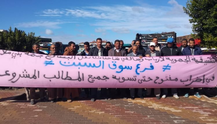 يستمر اضراب ارباب شاحنات نقل البضائع بسوق السبت اقليم الفقيه بن صالح للاسبوع الثاني على التوالي بسبب الزيادات المهولة في اسعار الكازوال وكذا القرارات المجحفة للوزارة الوصية في حق مهنيي النقل،اذ. يطالب المضربون