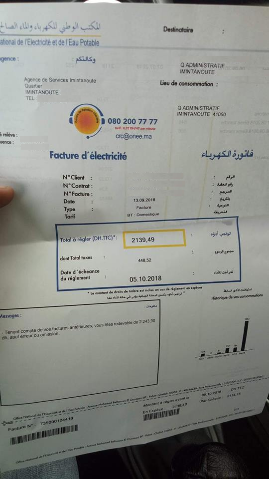 تفاجأ العديد من ساكنة امنتانوت وبالخصوص حول ثمن استهلاك الماء والكهرباء لهذا الشهر والشهر الماضي، حيث تضمنت فواتيرها ثمنا خياليا لدى البعض، تجاوز بكثير القدر المعتاد مقارنة مع الفواتير السابقة، وقد استنكر العديد من السكان الذين اكتووا بنار الزيادة الصاروخية التي احرقت جيوبهم، بحيث تزامن ذلك مع العيد والدخول المدرسي، مما جعلهم يكابدون ويعانون بشدة امام استحالة تادية هاته المبالغ، مما سيؤزم وضعهم المادي اكثر بسببها.