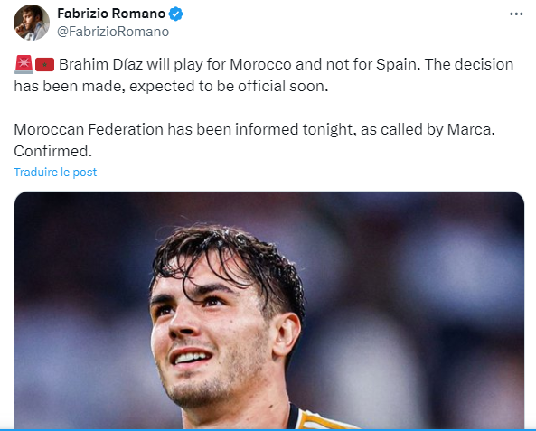 وقال فابريزيو في صفحته على موقع التواصل X: “إبراهيم دياز سيلعب للمغرب وليس لإسبانيا. تم اتخاذ القرار ويجب أن يصبح رسميًا قريبًا. تم إبلاغ الاتحاد المغربي هذا المساء”.