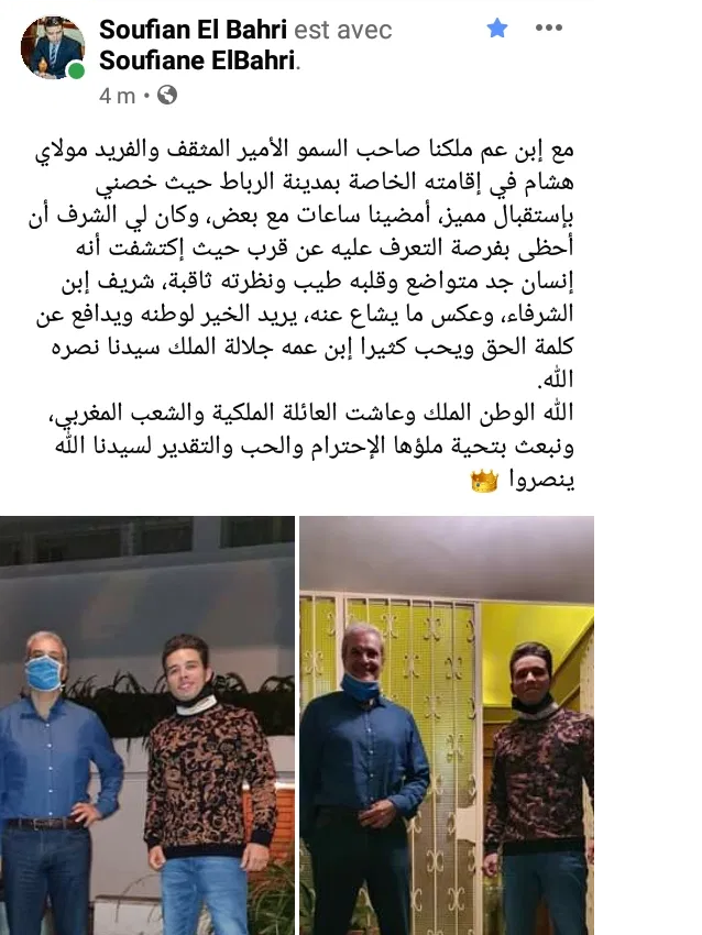 استقبل الأمير المثير أو الملقب بالأمير الاحمر هشام العلوي، ابن عم الملك محمد السادس، بإقامته الخاصة بمدينة الرباط الناشط الفيسبوكي سفيان البحري.