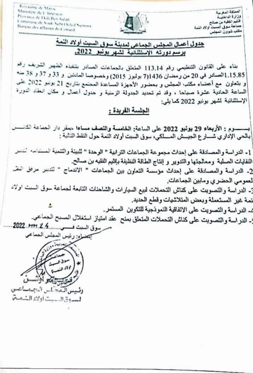 عقد المجلس الجماعي لمدينة سوق السبت إقليم الفقيه بن صالح دورة إستثنائية بتاريخ: 29 يونيو 2022 على الساعة الخامسة والنصف مساء، وكعادته فقد كانت هذه الدورة مغلقة وهي كما يبدو عادة دأب عليها المجلس وإن كانت في الأصل جلسات مجلس الجماعة مفتوحة أمام العموم، وفق ما جاء في الفقرة الأولى من المادة 48 من القانون التنظيمي 113/14.