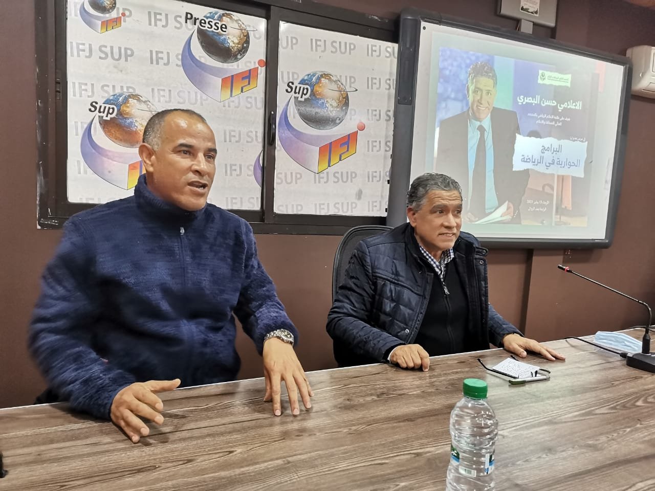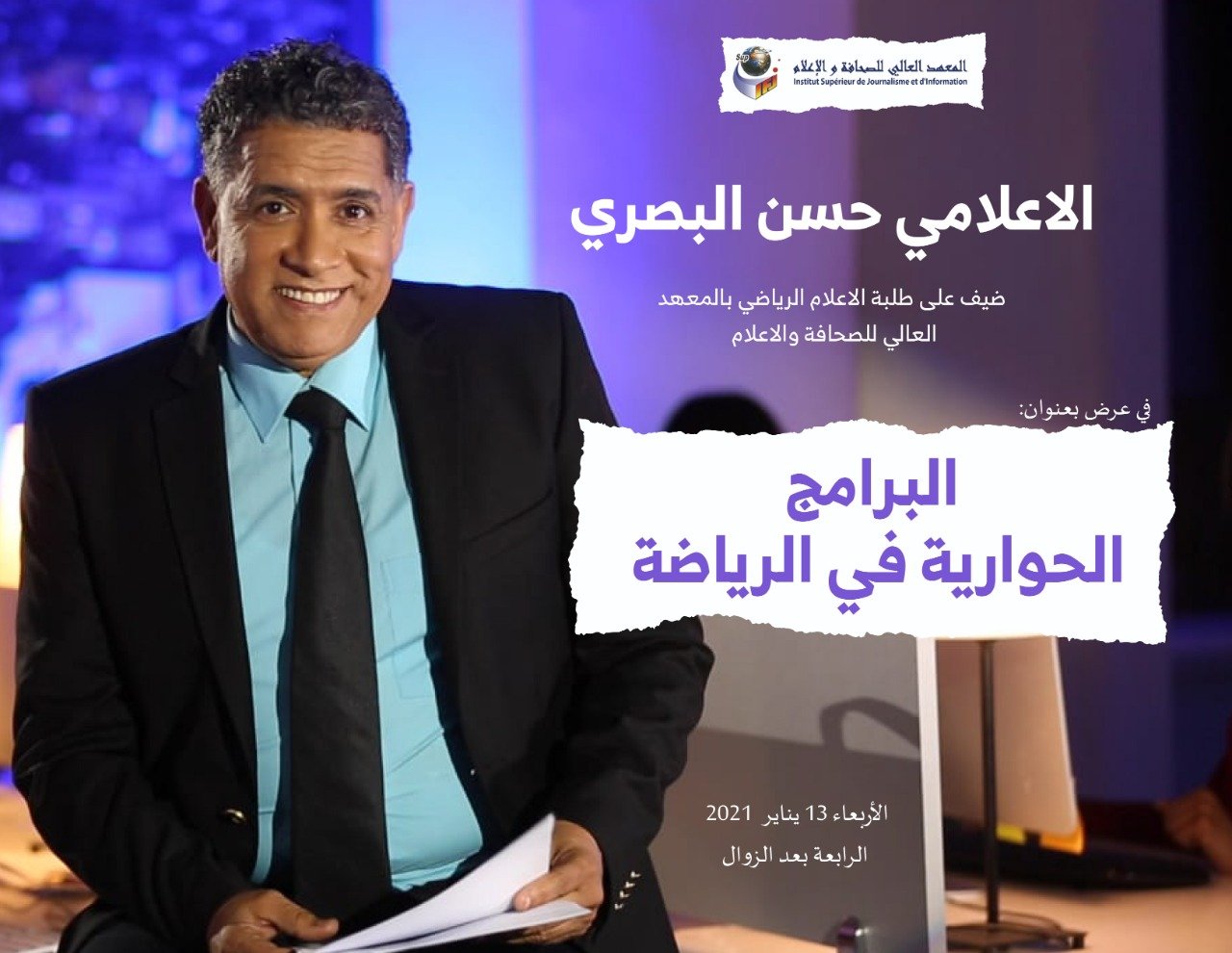 إستضاف طلبة وطالبات مادة الإعلام الرياضيifj sup في لقاء مفتوح مع الإعلامي الرياضي حسن البصري معد ومقدم برنامج كليسة رياضية بقناة تيلي ماروك، أمس الأربعاء 13 يناير، بمقر المعهد بقاعة العربي المساري الطابق الأول.