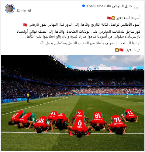 وتقدم المعلق البلوشي المرتبط صوته بتعليقات مباريات المنتخب المغربي بمونديال قطر (تقدم) بتهانئه للمنتخب المغربي توقعا مواصلته لمشوار الأولمبياد، ما يعني صعوده منصة التتويج والظفر بإحدى الميداليات.