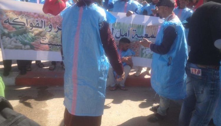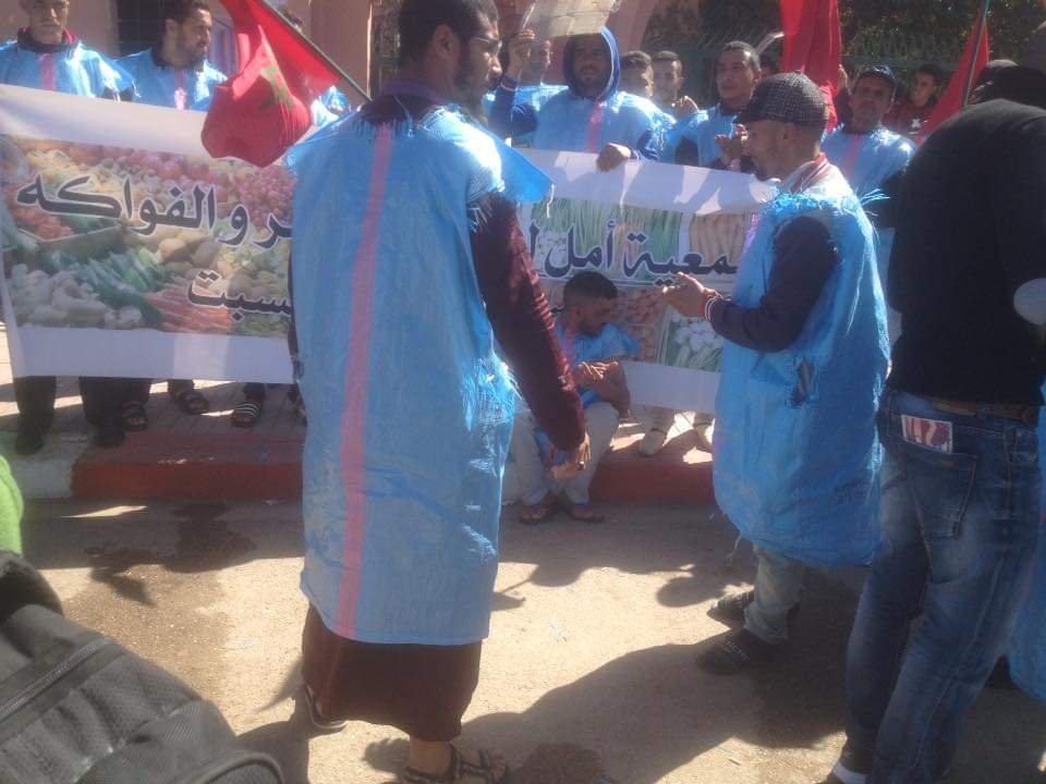 اضطر تجار الخضروات والفواكه بالتقسيط والذي سبق وان تم تنقيلهم قسرا من احدى الساحات التي مارسوا بها تجارتهم لمدة طويلة الى الاحتجاج امام بلدية سوق السبت بارتداع اكياس بلاستيكية زرقاء احتجاجا على ارتفاع حجم معانتهم وحرمانهم من ممارسة نشاطهم التجاري الذي عرف ركودا كبيرا بعدما تم تنقيلهم الى داخل اسوار السوق الاسبوعي الذي يتميز ببعده عن المدينة مما ادى بالعديد منهم الى الافلاس سيما انه تم حرمانهم من الاستفادة من متاجر بالسوق النمودجي،الوقفة سرعان ما تحولت الى مسيرة باتجاه عمالة الاقليم سعيا من التجار الى ايصال رستلتهم للمسؤول الاول بالاقليم