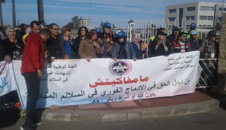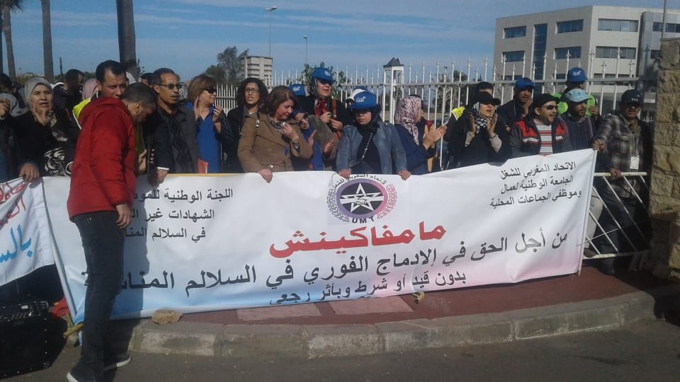 احتجاجا على الاقصاء والتهميش الذي يعاني منه موظفي الجماعات الترابية حاملي الشواهد العليا وموظفي القطاعات المشتركة بين الوزارات ، جراء اقصائهم من الادماج في السلالم المناسبة لشواهدهم الجامعية اسوة بزملائهم في القطاع افواج 2008.2009.2010 وموظفي الدولة في العدل والتعليم والصحة ، الذين تمت تسوية وضعيتهم الادارية بادماجهم في السلالم الادارية المناسبة؛ حج عدد كبير منهم اليوم من كل جهات الوطن الى الرباط للاحتجاج على هذه الوضعية الشاذة التي تتناقض مع مبدأ المساواة بين المواطنين التي ينبني عليها روح دستور المملكة. موازاة مع الحوار القطاعي الذي ينعقد اليوم مع الوفد النقابي بالمديرية العامة للجماعات المحلية بالرباط.