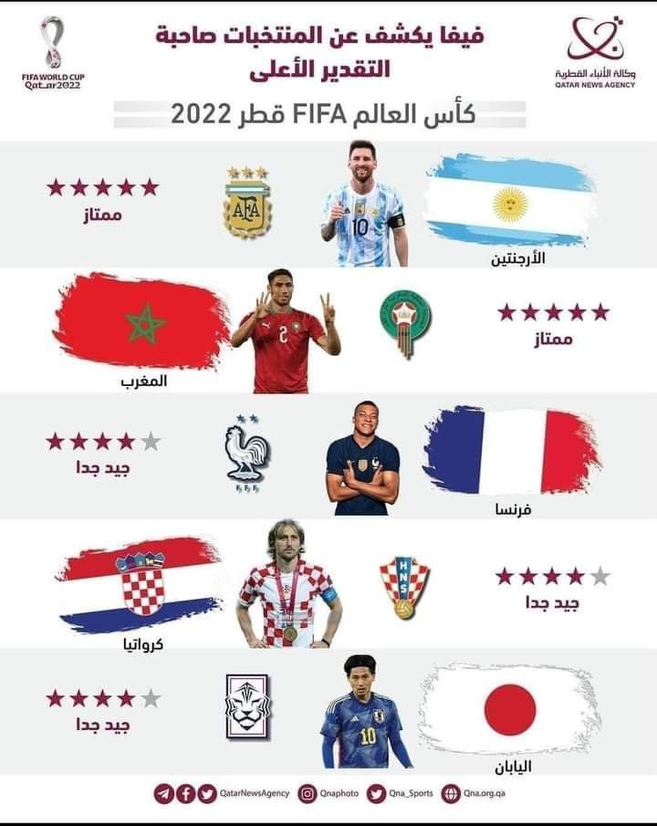 وتم منح المغرب والارجنتين بدرجة ممتاز، فيما اكتفت فرنسا بدرجة جيد جدا إلى جانب منتخبي كرواتيا واليابان.
