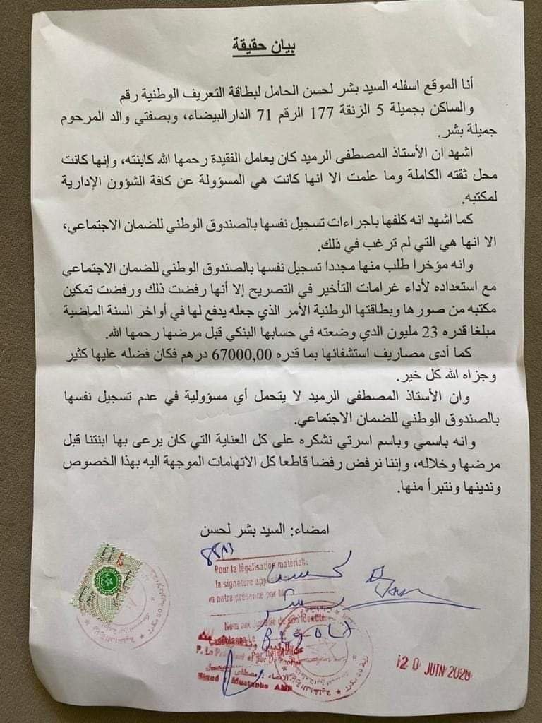 نفى القيادي في البيجيدي والبرلماني عن عمالة مقاطعات سيدي عثمان حي مولاي رشيد ورئيس مقاطعة سيدي عثمان بمدينة الدارالبيضاء محمد معايط جملة وتفصيلا ما ورد اليوم في المواقع الإلكترونية؛ بان المصطفى الرميد وزير حقوق الانسان قد قام بالاتصال به من اجل فتح ابواب مقاطعة سيدي عثمان من اجل توقيع على اشهاد “انظر الوثيقة ” يتضمن اعترفات حولة قضية قيد حياتها المسمى جميلة بشر الكاتبة ومديرة مكتب المحماماة وزير العدل السابق والقيادي مصطفى الرميد وزير حقوق الانسان وأضاف البرلماني و رئيس مقاطعة سيدي عثمان محمد معايط في تصريح خاصا به جريدة بالواضح اليوم السبت بان حشره في قضية بعيد عنها كل البعد ويضيف المتحدت نفسه ان مقاطعة سيدي عثمان كانت مغلق اليوم السبت 20 يونيو 2020 ؛ منبها الى خطورة كتبة الاشاعة وكلام مجانب لصوب وبخصوص الوتيقة التى يصرح فيها اب المرحومة جميلة بشر بان مصطفى الرميد منح 23 مليون سنتيم الابنته التى كانت تعاني من مرض ويضيف الاب ان وزير حقوق الإنسان طلب منها مرار التسجيل في صندوق الضمانالاجتماعي لكن ابنته جميلة كانت ترفض ذلك .