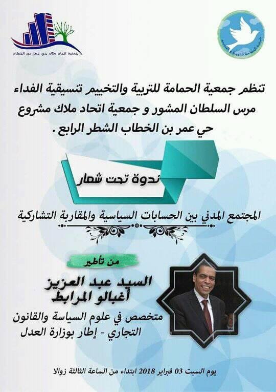 تنظم جمعية الحكامة للتربية والتخييم تنسيقية الغذاء مرس السلطان وجمعية اتحاد ملاك مشروع حب عمر بن الخطاب الشطر الرابع ندوة تحت شعار :” المجتمع المدني بين الحسابات السياسية والمقاربة التشاركية ” من تأطير عبدالعزيز اغبالو المرابط متخصص في علوم السياسة والقانون التجاري وإطار بوزارة العدل وذلك يوم السبت 3 فبراير ابتداءا من الساعة الثالثة زوالا.