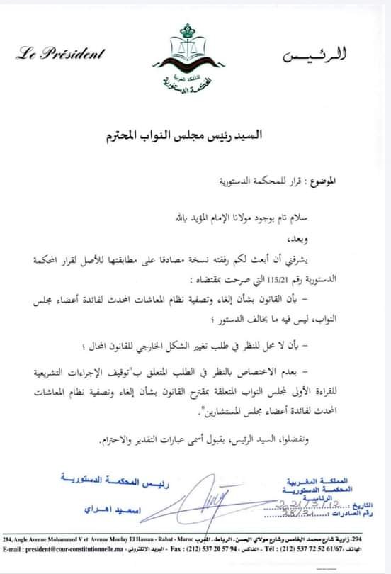 أصدرت المحكمة الدستورية قررارها رقم 115/21 بالإبقاء على قرار إلغاء تصفية معاشات النواب البرلمانيين قائلة إنه ليس فيه ما يخالف الدستور، وذلك على خلفية الرد على الطعن الذي تقدم به فريق الأصالة والمعاصرة.