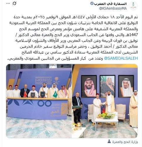 وفي سياق التفاصيل الواردة في تغريدة سفير خادم الحرمين الشريفين لدى المغرب الدكتور سامي بن عبدالله الصالح، جرت مراسيم التوقيع بحضور السفير وعدد من كبار المسؤولين من الجانبين السعودي والمغربي، إذ يندرج هذا الاتفاق ضمن التحضيرات السنوية المنظمة لشؤون الحجاج وتحديد الحصص وترتيبات استقبالهم خلال موسم الحج المقبل.