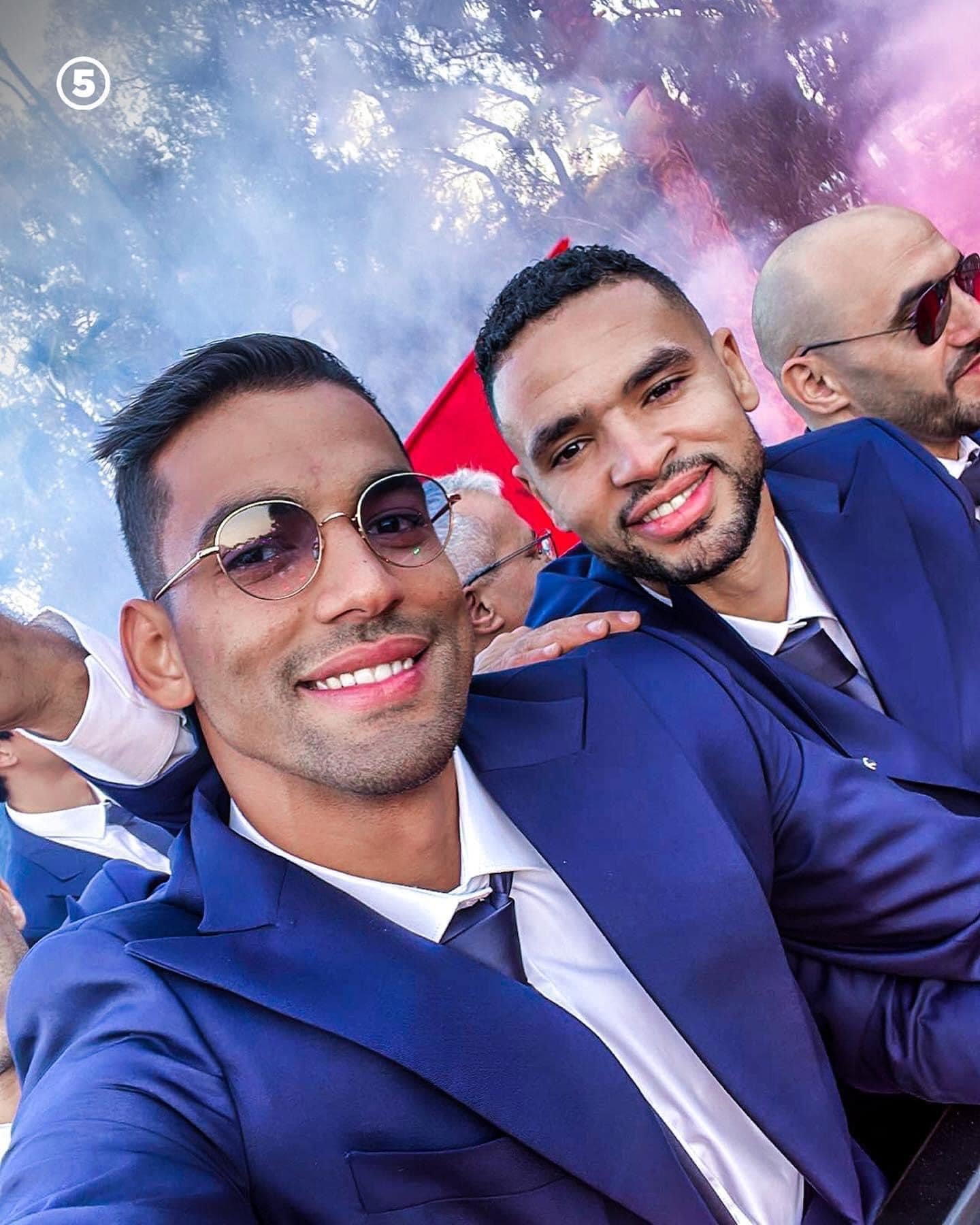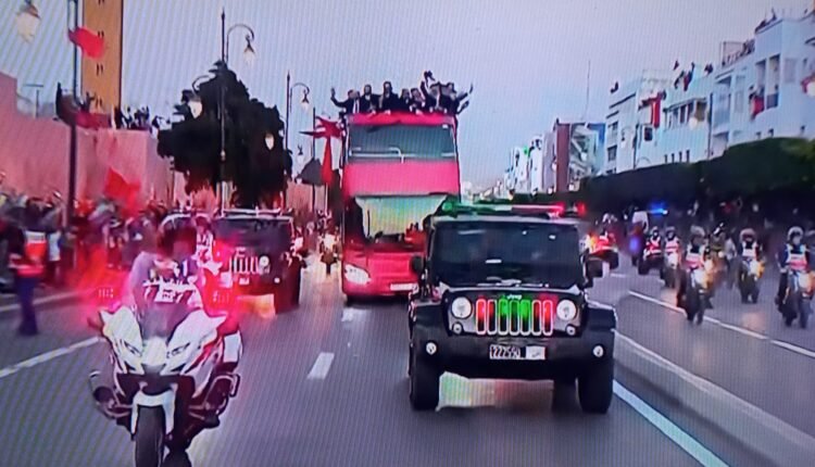 وبعد طول الانتظار الممزوج بمشاعر الشوق للحظة الموعودة، ظهر الأسود في الأفق وهم يهمون بالصعود للحافلة المكشوفة المجهزة لهذه المناسبة، في ظل أجواء حماسية مطبوعة بمزيج من الزغاريد والهتافات والشعارات التي تمجد المنتخب الوطني وأدائه التاريخي.