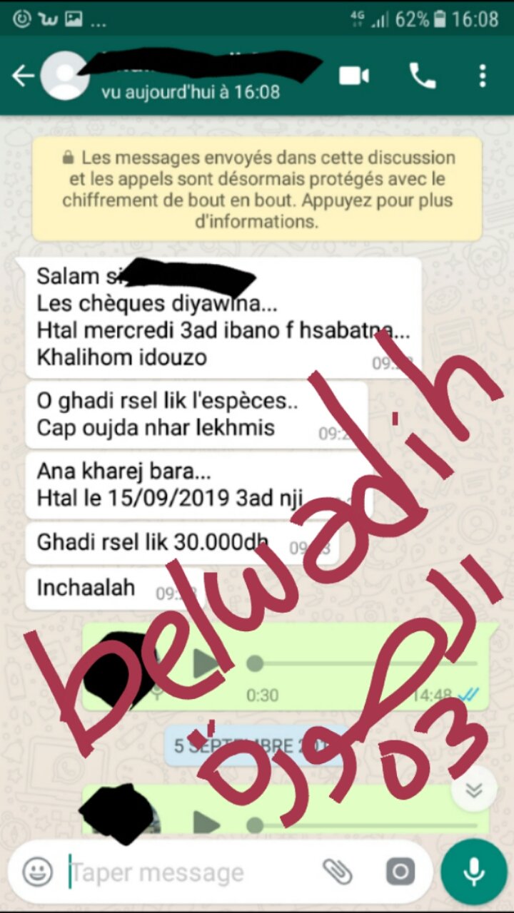 ولانك بدون أدنى حس مسؤولية فبتاريخ 6 شتنبر راسلت أحد ضحاياك بحسب الثابت من دردشة واتساب التي ننشرها لكي لا تكذبنا مرة أخرى (الصورة 03) مخبرا اياه ان امواله ستكون بحساباته يوم الاربعاء ووعدته انك سترسل إليه حوالة مالية بقيمة 30 ألف درهم وانك تتواجد خارج التراب الوطني وستعود إلى أرض الوطن يوم 15 شتنبر ولا داعي للتأكد والبحث ما ان كنت خارج أرض الوطن أو داخله، لكن لما إلى يومنا هذا لم يتوصل هذا المواطن البسيط بماله اليس هذا تحايل واضح وتهرب من المسؤولية.