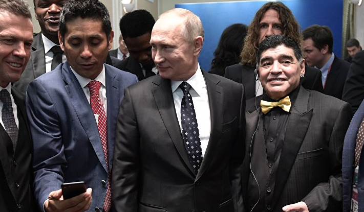 خلال الحفل الصغير الذي جمع،الجمعة الأخير، بقصر الكريملين بالعاصمة الروسية موسكو، نجوم الكرة العالمية السابقين، بحضور الرئيس الروسي فلاديمير بوتين على هامش قرعة كأس العالم 2018، شهد الحفل حضور كل من الأرجنتيني مارادونا والبرازيلي بيليه، تخللته بعض المشاهد الطريفة وبخاصة لحظة دخول الرئيس الروسي فلاديمير بوتين إلى القاعة للترحيب بالضيوف.