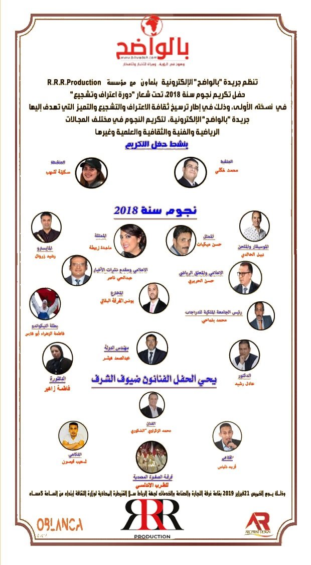 تنظم جريدة بالواضح بتعاون مع مؤسسة R.R.R.Production، يوم الخميس 21 فبراير 2019، حفل تكريم نجوم سنة 2018 في دورتها الأولى، وذلك ابتداء من الساعة الخامسة مساء بقاعة غرفة التجارة والصناعة والخدمات لجهة الرباط سلا القنيطرة المحاذية لوزارة الثقافة، حيث سيتم تكريم فنانين وإعلاميين ورياضيين ومثقفين من مختلف التخصصات والمشارب، تحت شعار “دورة اعتراف وتشجيع”.