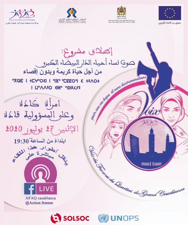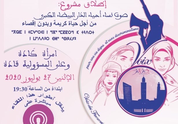 وتنظم حركة نساء جمعيات أحياء الدار البيضاء الكبرى لقاء إطلاق مشروع: “صوت نساء أحياء الدار البيضاء الكبرى، من أجل حياة كريمة ودون إقصاء”، مساء يوم الاثنين27 يوليوز 2020 على الساعة 19:30، تَحتَ عنوان: “امرأة وكَادة وعلى المسؤولية قادة”، على صفحة الفايسبوك الرسمية للحركة.