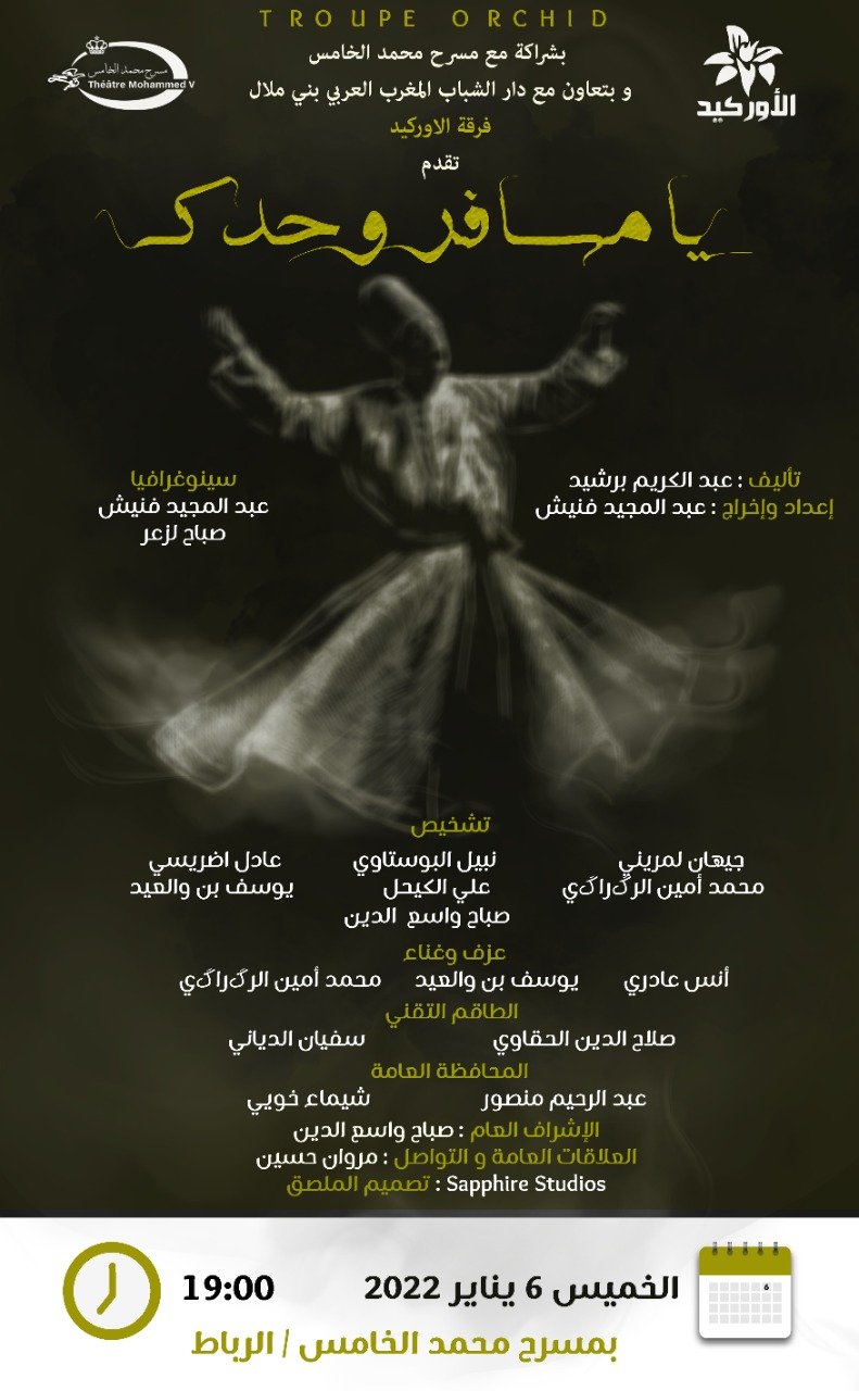 تتويجا لأربعين سنة من إبداع الثنائي عبدالكريم برشيد وعبدالمجيد فنيش فرقة الأوركيد بشراكة مع مسرح محمد الخامس تقدم مسرحية “يا مسافر وحدك”.