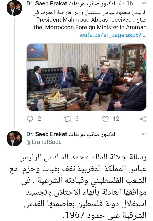 وكان أمين سر اللجنة التنفيذية لمنظمة التحرير الفلسطينية صائب عريقات قد كتب في تغريدة له على موقع التواصل الاجتماعى تويتر بأن “رسالة جلالة الملك محمد السادس للرئيس عباس المملكة المغربية تقف بثبات وحزم مع الشعب الفلسطيني وقيادته الشرعية ، فى مواقفها العادلة بأنهاء الاحتلال وتجسيد استقلال دولة فلسطين بعاصمتها القدس الشرقية على حدود 1967.”