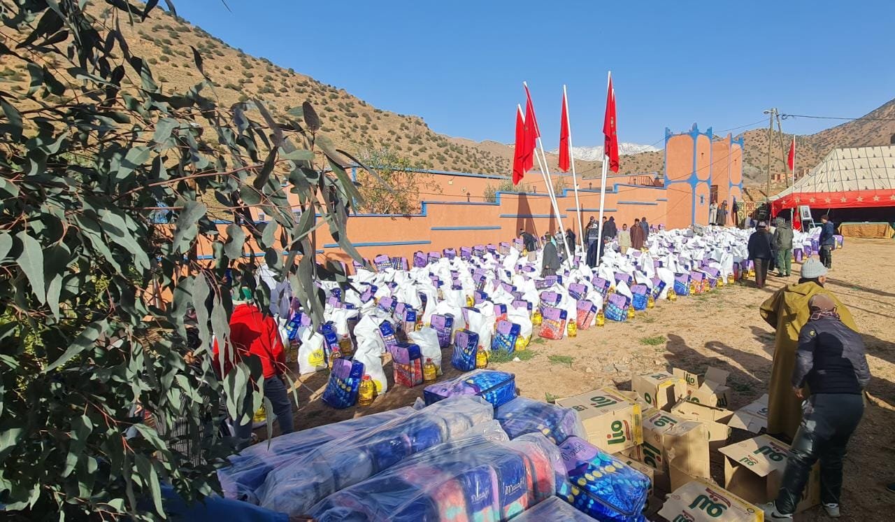 يشار إلى أن مقر عمالة تارودانت استقبل، أمس الاثنين، المساعدات الإنسانية الاستثنائية الموجه لـ10 آلاف أسرة تنحدر من 8 جماعات بالإقليم، والتي تأتي تنفيذا للتعليمات السامية لصاحب الجلالة الملك محمد السادس، إثر التساقطات الثلجية الهامة التي شهدتها أقاليم زاكورة وورزازات وتارودانت.وكان صاحب الجلالة الملك محمد السادس، قد أعطى تعليماته السامية بإطلاق عملية مساعدة عاجلة لفائدة السكان المتضررين من موجة البرد الحالية والتساقطات الثلجية، حسب بلاغ لمؤسسة محمد الخامس للتضامن.