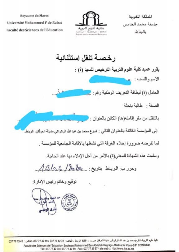 كما اعتبر ان تنقل الطالب المسجل بالكلية يتطلب الحصول على اذن مكتوب في هذه الحالة من ادارة الكلية من أجل تسليمه للسلطات المعنية، وان ما وقع ربما فيه نوع من اللبس في عنوان الوثيقة، علما ان هذه الوثائق المسلمة للطالبات من اجل التنقل تتضمن في الاسفل ملحوظة انه يتعين الادلاء بها لدى السلطات المحلية للحصول على الرخص النهائية.