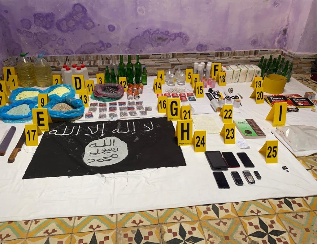وتابع المصدر أن عمليات التفتيش التي أجراها ضباط المكتب المركزي للأبحاث القضائية وخبراء مسرح الجريمة بهذا المسكن الأخير، وبمنازل المشتبه فيهم، أسفرت عن حجز راية من الثوب تجسد شعار تنظيم “داعش”، ومخطوط ورقي يتضمن نص البيعة للخليفة المزعوم لهذا التنظيم، ومجموعة من الأسلحة البيضاء المتعددة الأنواع والمختلفة الأحجام، ومعدات معلوماتية وأجهزة إلكترونية.