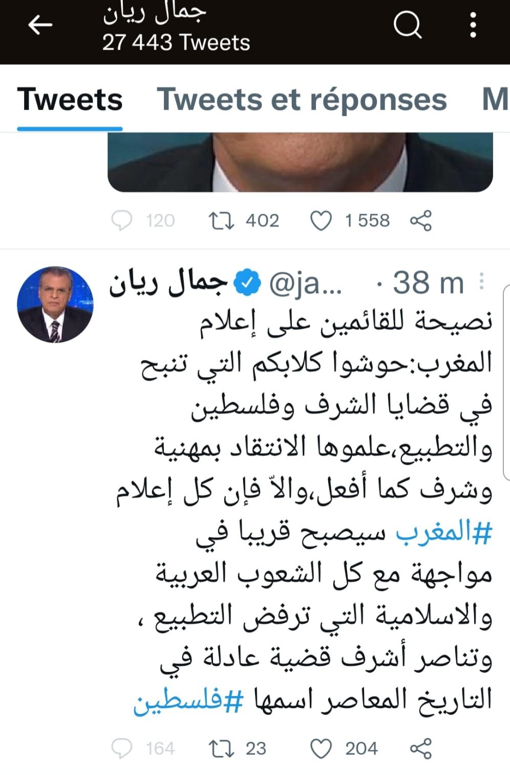 جمال ريان المعروف بعقدة عدم ارتوائه من معين الدراسة والتحصيل وعدم استقراره المهني امام إدارة الجزيرة التي أعادته مؤخرا إلى الشاشة بعد توقيفه عنها لمدة طويلة، يعاني من انفصام في الشخصية والتحليل، إن سلمنا جدلا أن له تحليلا بالسرقة… عفوا بالسليقة، حيث في الوقت الذي ينتقد التطبيع تراه أشد المدافعين عن فلسطين رغم علمه وعلم الجميع بالزيارة التي قام بها مؤخرا محمود عباس لبيت وزير الدفاع الاسرائيلي…