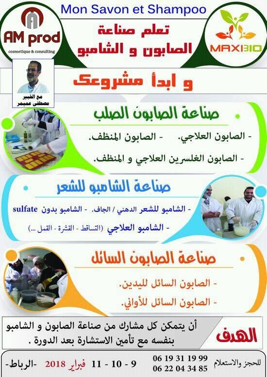 في سابقة في مجالي التكوين وتوفير فرص الشغل لدى الشباب بالمغرب، تنظم شركة MAXIBIO بشراكة مع AM Prod دورة تكوينية في صناعة الشامبو والصابون بجميع أنواعه، وذلك من تأطير الخبير مصطفى عميمر، على مدى 3 أيام، من 9 فيراير 2018 إلى 11 منه.