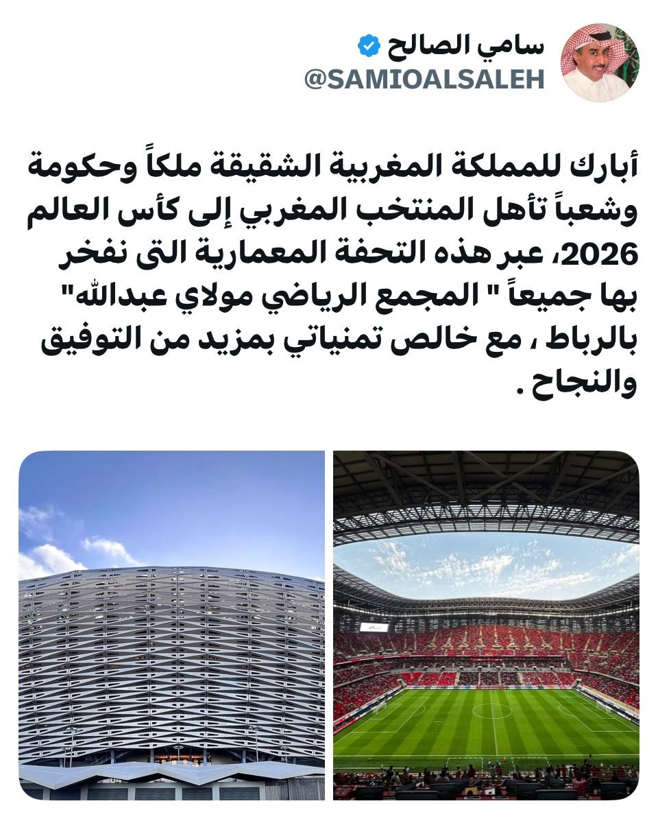وأشاد السفير السعودي، في تغريدة على حسابه الرسمي بموقع “إكس”، بالتحفة المعمارية التي احتضنت هذا الإنجاز، واصفا ملعب مولاي عبدالله بـ”التحفة المعمارية التي نفخر بها جميعا”، في إشارة إلى ما يشكله من إضافة نوعية للبنية التحتية الرياضية في المغرب، وتجسيد للهوية والرؤية المغربية في تحديث المنشآت وفق معايير دولية.