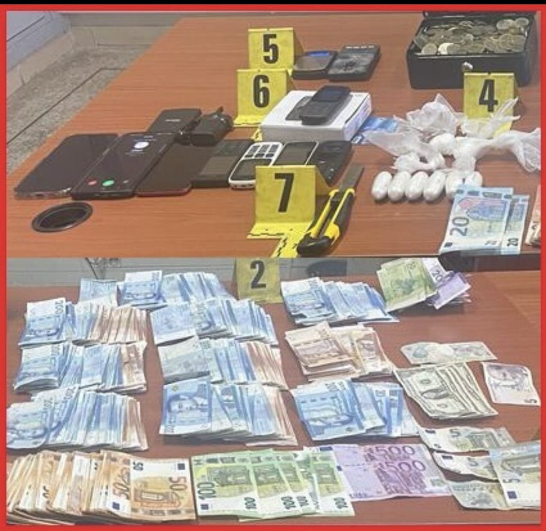وقد أسفرت الأبحاث والتحريات المنجزة في هذه القضية عن تحديد هوية شريكي الموقوف الأول في هذا النشاط الإجرامي، حيث تم توقيفهما والعثور بحوزة واحد منهما على 57 غرام من مخدر الكوكايين وميزان إلكتروني وسبعة هواتف محمولة، علاوة على مبالغ مالية تتكون من 98 ألف درهم و4120 أورو وأوراق مالية من عملات أجنبية أخرى.