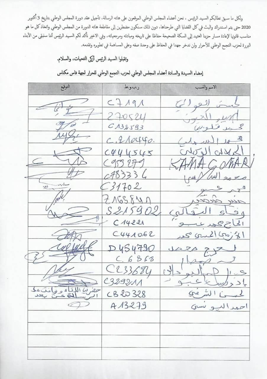تنفرد “بالواضح” بنشر وثيقة تتضمن رسالة وجهها أعضاء حزب التجمع الوطني للأحرار على مستوى جهة فاس مكناس، وتتضمن هذه الوثيقة توقيعات لأعضاء من قيادة الحزب من بينهم أحد أعمدة حزب الحمامة بتاونات الحاج أحمد عبو أبو الوزير السابق محمد عبو إضافة إلى النائبة البرلمانية وفاء البقالي وعدد من القيادات بمختلف عمالات واقاليم جهة فاس مكناس.