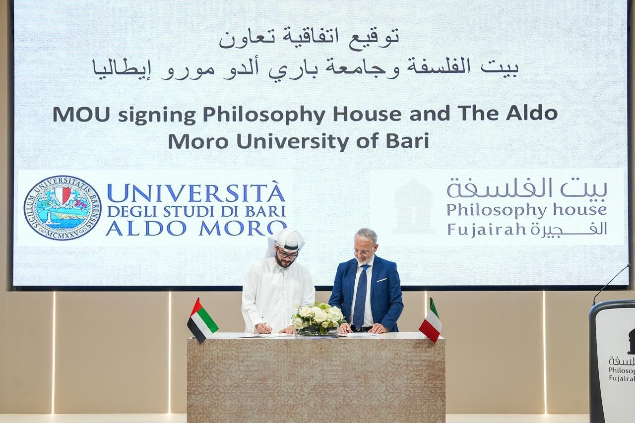 وجرى بالمناسبة التوقيع على اتفاقية تعاون بين مدير بيت الفلسفة الدكتور أحمد السماحي، وممثل جامعة بارى ألدو مورو الإيطالية، الدكتور باولو بونزيو.