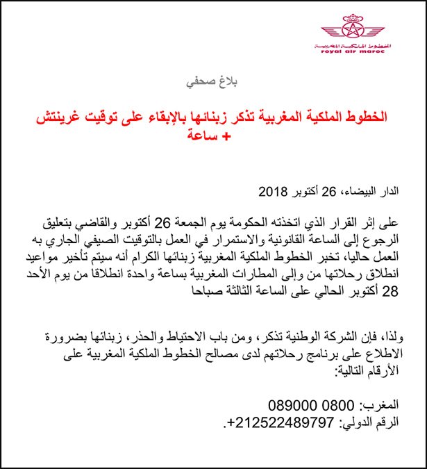 وأكدت “لارام”، في بلاغها، بأنه سيتم تأخير مواعيد انطلاق رحلاتها من وإلى المطارات المغربية بساعة واحدة انطلاقا من يوم الأحد 28 أكتوبر الحالي على الساعة الثالثة صباحا.