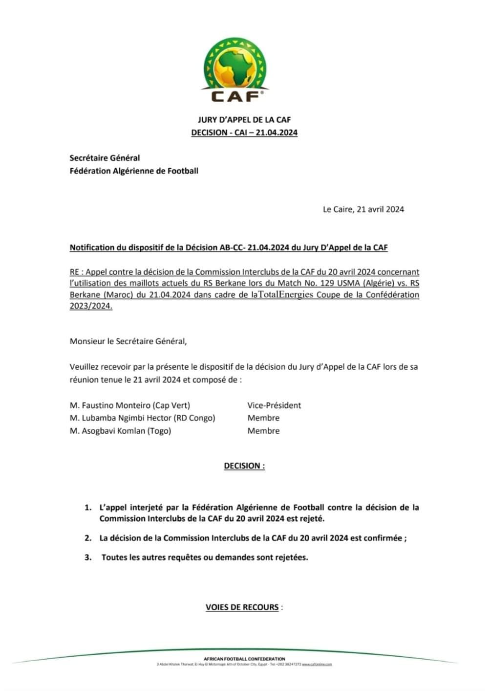 أصدرت لجنة الاستئناف قرارها بتأييد أحقية نادي نهضة بركان في ارتداء قمصانه الرسمية التي شارك بها في مسابقة كأس الاتحاد هذا الموسم وذلك على خلفية قضية احتجاز نادي اتحاد الجزائر العاصمة للقمصان البركانية لتضمنها خريطة المغرب كاملة.