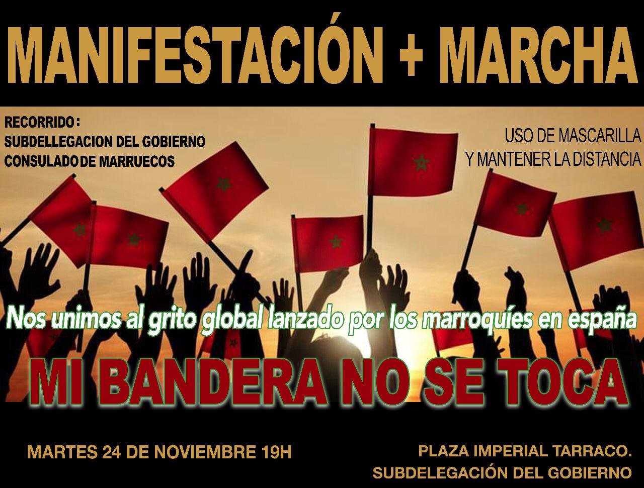 تنظم ساكنة تاراغونا (كاتالونيا) والجمعيات المغربية وأعضاء المنظمات المهنية والهياكل السياسية والثقافية والمجتمع المدني بتنسيق مع سلوى البشري القنصل العام للمملكة المغربية بجهة تراغونا ليريدا وارغون مسيرة لدعم ملف الصحراء المغربية تحت شعار “Mi bandera no se toca” (علمي لا يمكن المساس به) و قد تم تحديد تاريخ الوقفة في يوم الثلاثاء 24 نوفمبر على الساعة 7 مساءً، في أكبر ساحة بالمدينة.