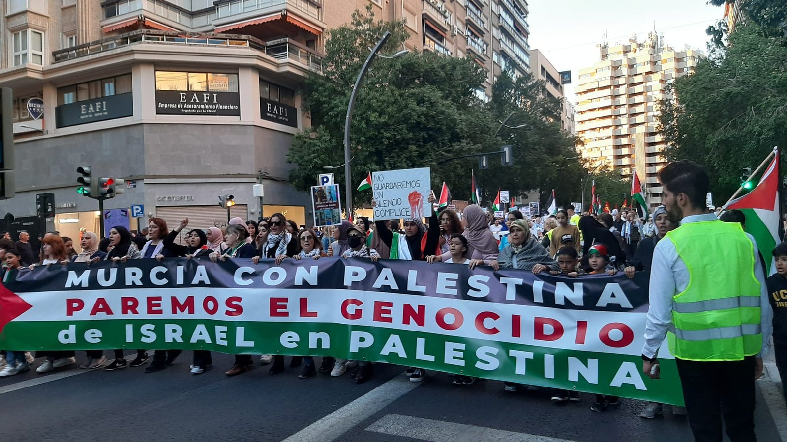 كانت انطلاق هذه المظاهرة على الساعة الخامسة مساء يوم الأحد بساحة “دي لا فوينسانتا”، واتجهت إلى شارع غران فيا وتينينتي فلومستا في إتجاه المقر الحكومي للحكم الذاتي حاملة لافتة كبيرة كتب عليها “مورسيا مع فلسطين”. دعونا نوقف الإبادة الجماعية الإسرائيلية في فلسطين.