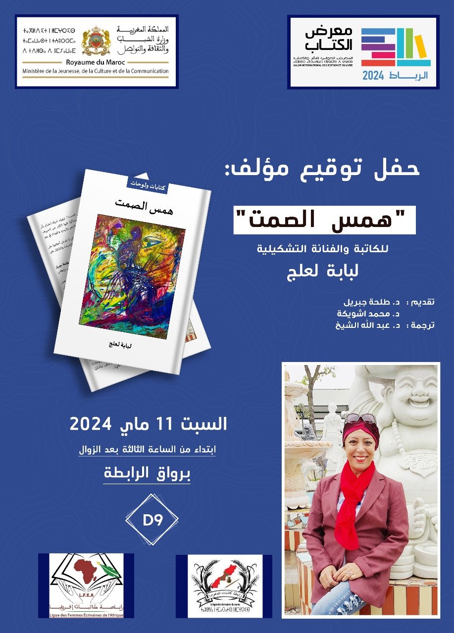 وَطَّنَت الفنانة لبابة لعلج عملها الإبداعي ضمن سلسلة “كتابات ولوحات” للإشارة إلى الجمع الواعي والمقصود بين اللوحة الفنية والكتابة الإبداعية المنفتحة على القصيدة والشذرة، وقد قسمت عملها الموسوم بـ”همس الصمت” إلى شقين اثنين: “همس وصمت” و”أبجديتي”، فجاءت الأعمال متصادية في ما بينها، تجمعها روح متدفقة من منبع واحد أساسه تلك الذات المتأملة والمتألمة التي يدفعها البحث عن الحقيقة نحو الانسيابية والبوح الروحي والعاطفي والوجداني.