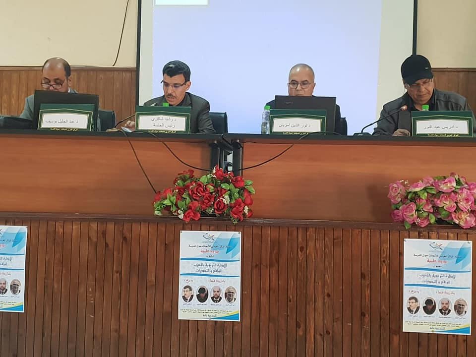 نظم المركز المغربي للأبحاث حول المدرسة ندوة علمية بعنوان “الإدارة التربوية بالمغرب: الواقع والتحديات” يوم الجمعة 23 رجب 1440ه الموافق ل 29 مارس 2019 بقاعة الندوات بالفرع الإقليمي للمركز الجهوي لمهن التربية والتكوين بمكناس “حمرية” ترأسها د رشيد شاكري مفتش مادة اللغة العربية بأكاديمية فاس والباحث في قضايا التربية والتكوين والتي حضرها عدد مهم من الفاعلين الإداريين والتربويين والباحثين في المجال.